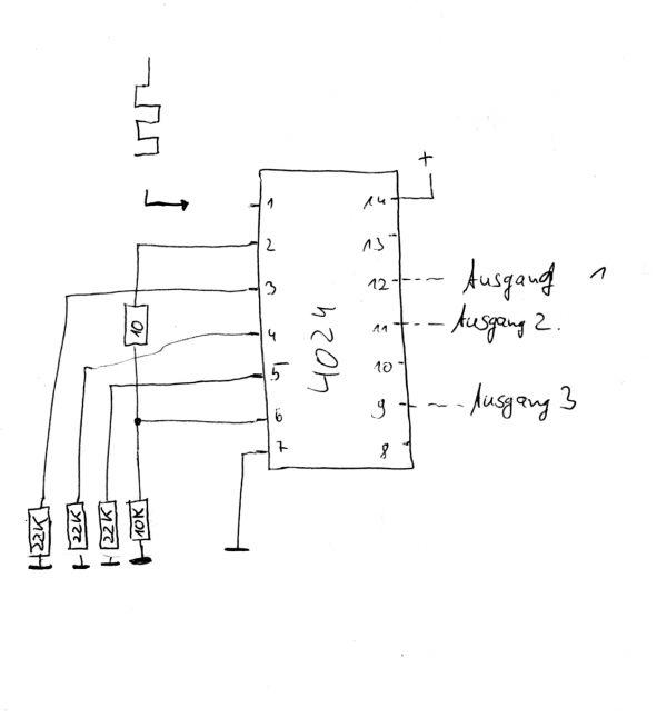 HI. Für meine LED Schaltung habe ich einen Ringzähler IC 4024 verwendet. Dieser hat 7 Ausgänge. Ich benötige nur Ausgang 1-3. Er soll immer zählen 1,2,3,1,2,3... Deshalb habe ich Ausgang 4-7 mit einem 22k widerstand mit Masse verbunden. Gleichzeitig noch ausgang 4 mit Reset, damit er da gleich aufhö...