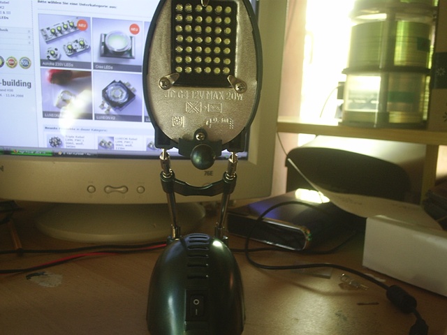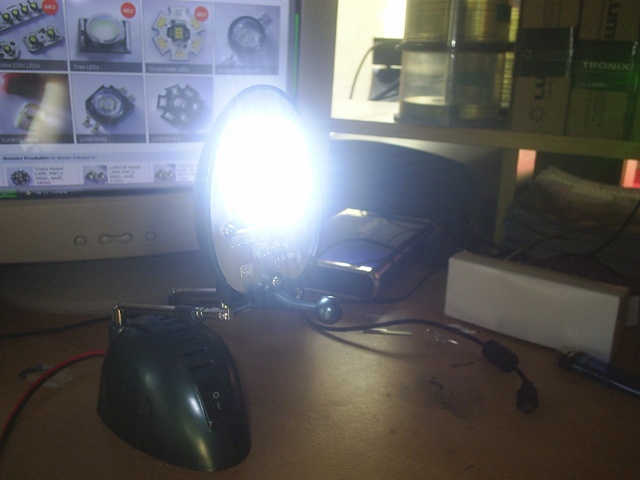 So habe nun nach längerer Zeit mal gestern die Lampe mal wieder umgebaut diesmal von Led nach Led ;-). Mit den 3mm Led’s war ich nicht mehr so einverstanden, zudem war das ganze vorerst an 12V - gebunden (Netzteil hätte Abhilfe schaffen können integriert). Nun habe ich das ganze mit einer Cree Q5 Modifiziert die mit einer 700mA ksq an 230V ~ einwandfrei läuft!