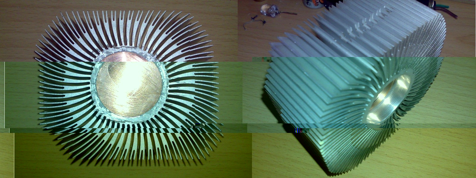 Anbei werfe ich nochmal ein Bild von einem Kühlkörper in die Runde, der den Namen auch verdient. In der Mitte massives Kupfer eingepresst in Aluminiumrippen. Der stammt aus einem alten Rechner von der CPU.