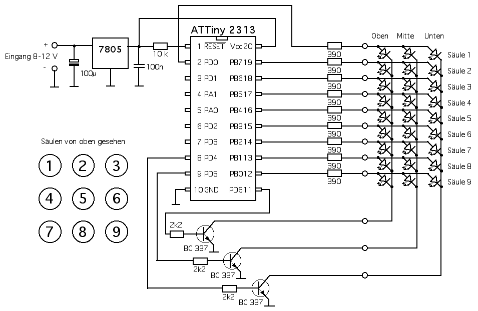 Das geht (eigentlich) nicht. Der Attiny2313 verträgt zwar pro Pin 40mA, aber insgesamt nur maximal 200mA. Bei 9x30mA kommen aber schon 270mA zusammen. Besser höchstens 20mA pro LED vorsehen. Ansonsten müsste man (eigentlich) auch für jede Säule noch einen Transistor einsetzen.ich will meine LEDs mit 30mA betreiben