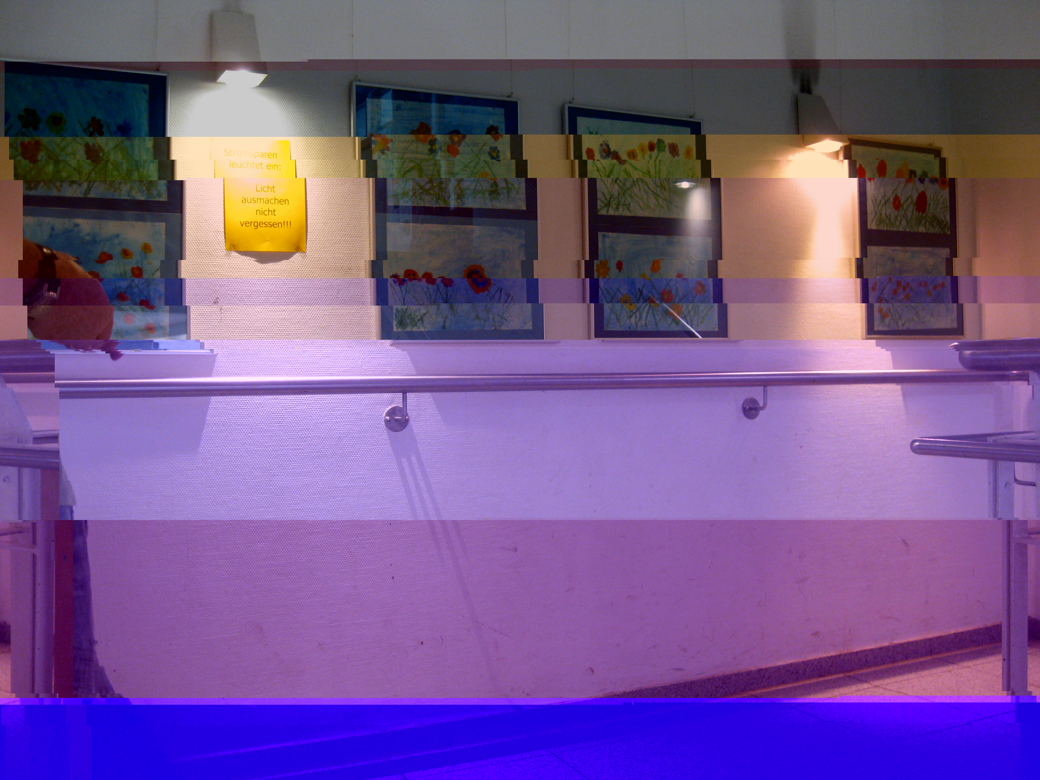 Bemerkenswert sind auch die dunklen Dreckschlieren, die so ein heißer Halogenspot verursacht (rechts Notbeleuchtung 24 h/d).