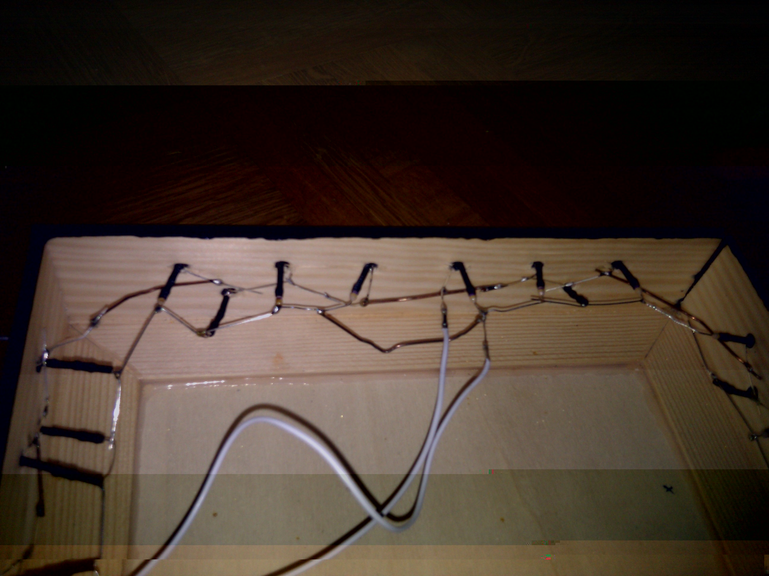 5. der "Draht": Ja, schlagt mich (aber nicht zu fest bitte). Das sind zweckentfremdete Büroklammern - aus Kupfer. Mir war diese feste Brücke lieber, als zwischen jede Lücke 3 cm Kabel zu spannen. Und bitte denkt dran: es ist mein erstes Werk... :oops: