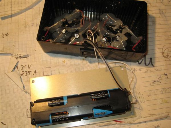 Die LEDs sind hier bereits präpariert, d.h. an einer Seite mit dem jeweiligen Widerstand verlötet. Die Wirderstände ergeben sich aus Batteriespannung 4x1,5V=6V, bei 3,1V der LED muss der Widerstand jeweils 2,9V vernichten, ergibt (bei 20mA) 2,9V geteilt durch 0,02A = 145Ω. Der nächsthöhere Normwiderstand ist 150Ω. Zwar liegt die Spannung frischer Batterien teilweise über 1,6V (ALDI), fällt dann aber schnell ab, so dass dieser Widerstand ein guter Durchschnitt auch für schwächere Baterien ist. Die LEDs wurden jezt alle parallel, je nach Elektrode, verkabelt, in die Fassungen eingesetzt, und die Beinchen (um Platz für das Batteriefach zu machen) auf den "Boden" bzw an die Seitenwand gebogen.