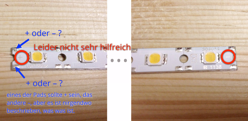 Irgendwie finde ich nirgendwo mal eine Beschreibung, ein Bild, oder einen Schaltplan. An der Leiste selbst ist ganz links mittig ein + und ganz rechts ein -, aber es gibt ja an jedem Ende 2 Kontaktpads, und für gewöhnlich ist da eines + und eines - und zum in Reihe schalten ist es auf der anderen Seite genauso.... nur welches Pad ist nun plus und welches ist Minus?! Ich bin wirklich genervt.