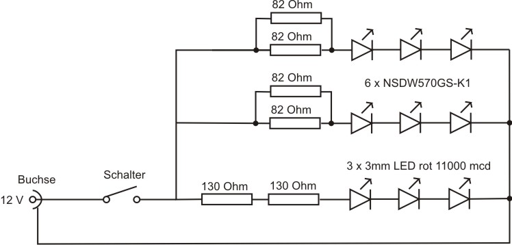 Die LEDs habe ich zu 3 Reihenschaltungen mit je 3 LEDs verschaltet: