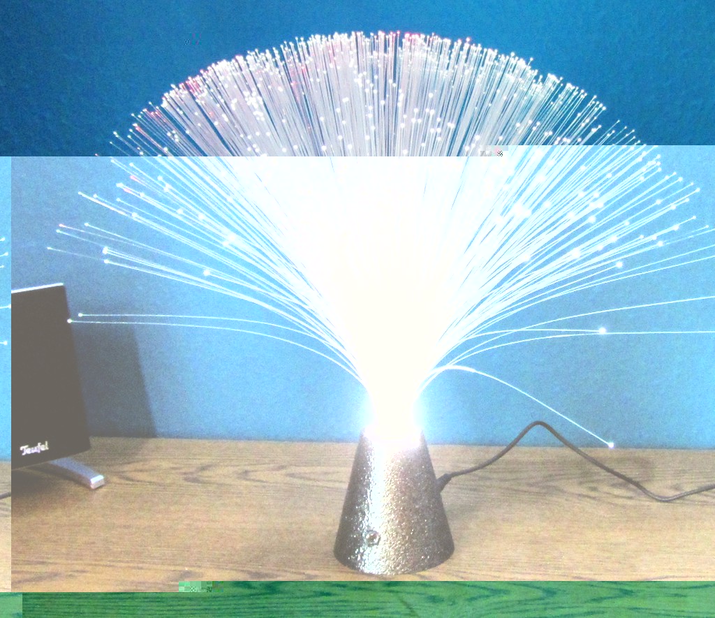 Wie man sieht, ist der Effekt nich gerade berauschend. Das Fiberglasbündel ist zu keinem Zeitpunkt vollständig ausgeleuchtet, über die Lichtstärke braucht man gar nicht zu reden und außerdem wird das Ganze auch noch mit Batterien betrieben. Also: auf der Unterseite zwei Schrauben lösen, dann kann man das ganze Innenleben entsorgen.
