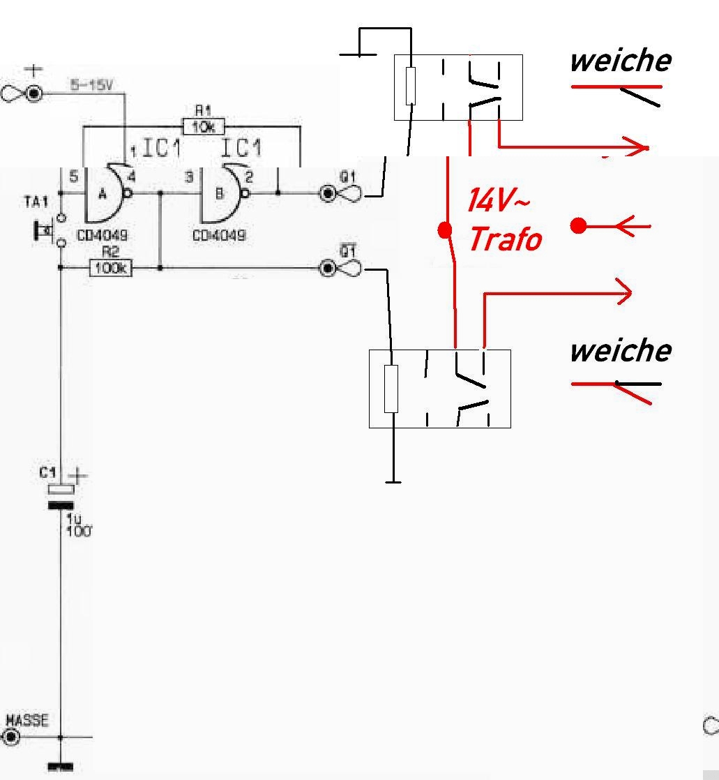 Den schaffe ich gerade noch. Allerdings den Weichenschaltplan, speziell den CD 4049 hätte ich so aufgezeichnet, wie er wirklich ist. Jedes Beinchen der Reihe nach... Aber gut, das sind die fachmännischen Schaltpläne.