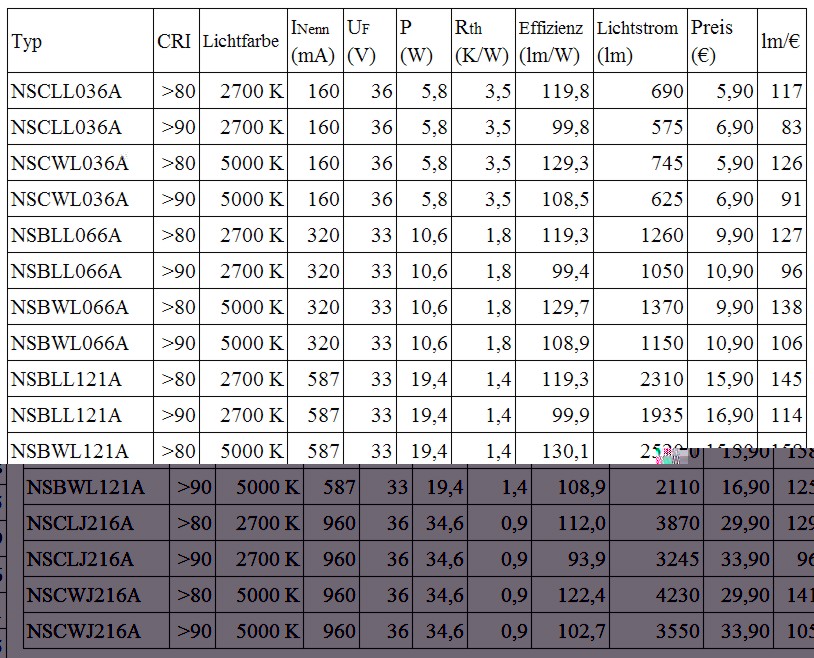Da die im Originalpost veröffentlichte Tabelle der COBs inzwischen hoffnungslos veraltet ist, hier mal eine Tabelle der aktuellen (Stand: April 2017) COB-Module von Nichia: