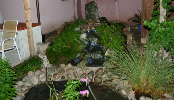Hingegen sind die weißen Leds auf dem Teichboden angebracht und leuchten nach oben an die wasseroberfläche. Weitere weiße Leds wurden in Pflanzen versteckt um diese zu beleuchten.