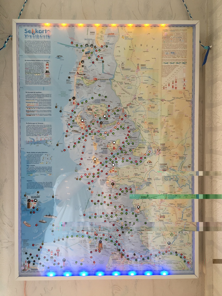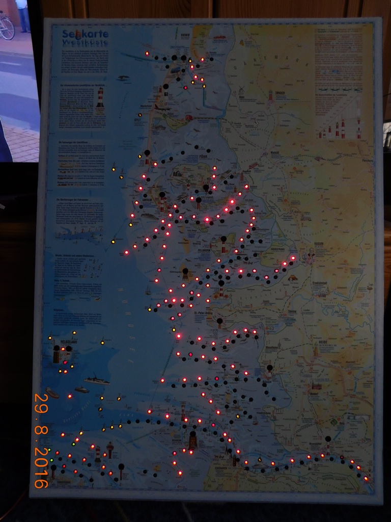 Ich habe habe nur 100 Euro benötigt. Knapp 300 Leuchtdioden (LED´s) symbolisieren Seefahrstraßen und Markierungen. Die roten und grünen LED´s sind die Fahrstraßenmarkierungen. Die gelben LED´s markieren zum Beispiel Hindernisse, Schiffwracks oder sonstige Gefahrensstellen auf See. Sie leuchten alle permanent.