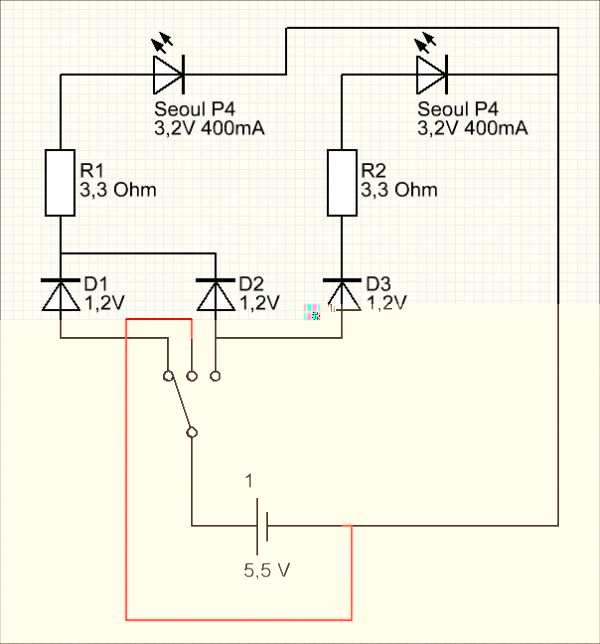 Die Halbleiterdiode hat eine recht ungenaue Spannung(Schwellspannung):Germanium ~ 0,3V, Silizium ~ 0,7V, Selen ~ 0,6V, Kupferoxydal ~ 0,2V. Das aber in unserem Fall nicht eine allzugroße Rolle spielt, da ja wir nur Leds betreiben wollen und kein bestimmtes Taktverhältnis oder genaue Spannung brauchen.
