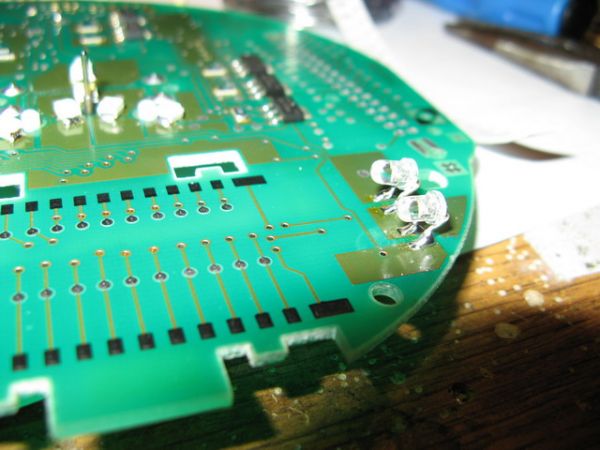 Die beleuchteten Tachonadeln (von einem Seat Leon) werden mit je 4 SMD-LED´s beleuchtet.