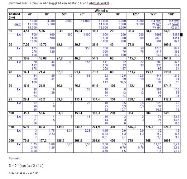 Aber danke für deine Bemühung bios-service! Bisher habe ich die beleuchtete Fläche für meine Projekte immer einzeln ausgerechnet und musste öfters mal meine Formelsammlung rauskramen, weil man sich shcließlich nicht alle Formeln merken kann. Jetzt hat man alles (zumindest die wichtigsten Abstände und Winkel) auf einen Blick, danke :)