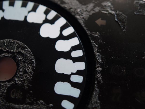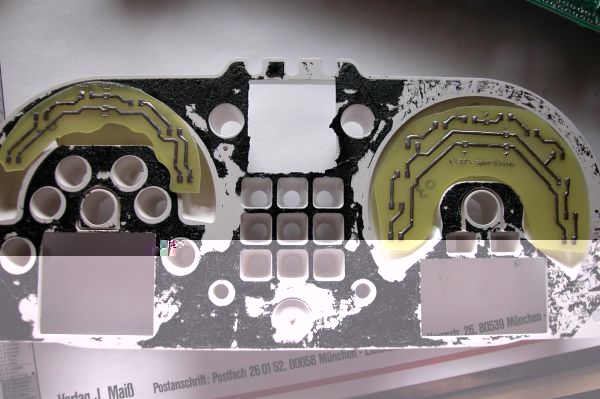 Das ist die Tachofolie von hinten. Wie man sehen kann, ist sie im Bereich der Zahlen mit einem durchscheinenden Lack überzogen. Dazu aber später mehr...