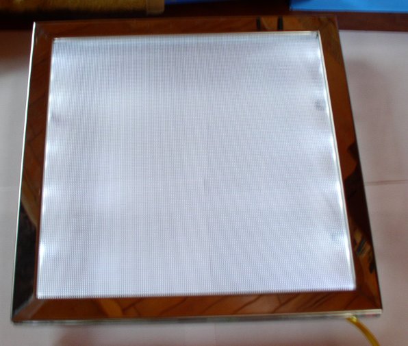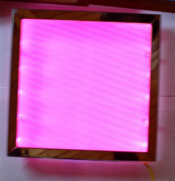 RGB Superflux bestellt, einen Rahmen aus Holz gebaut, LED's aller verlötet und getestet. Doch das Ergebnis war allerdings alles andere als zufriedenstellend. Ich hatte geplant eine Din A4 große Fläche mit den Superflux auszuleuchten in einem Abstand von etwa 6cm, aber die Ausleuchtung war nicht schön gleichmäßig geworden. Bei einem Abstand von etwas über 10cm sah das ganze schon wieder besser aus, allerdings wäre mir die Konstruktion dann einfach zu tief geworden. Also hab ich diese Idee erst mal wieder verworfen.