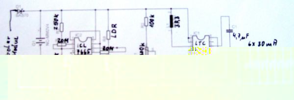 um einen strom von 3µA zu gewährleisten, könnte der trimmer weiter vorn auch etwas hochohmiger sein, wichtig ist aber, die einstellung des 2 trimmers( für die abschaltung bei helligkeit) mit dem angeschlossenem komparator vorzunehmen, da dessen ausgangsspannung ja nicht wirklich 0V wird! also mach den trimmer nicht zu
