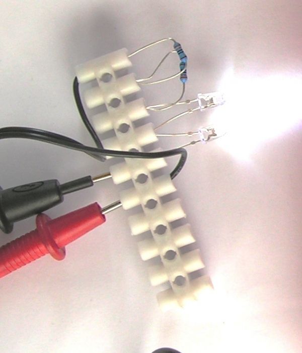 Nun schraube ich alles in meine Lüsterklemmen und schau mal wies gugt. Im Bild sind andere LED´s zu sehen, deswegen auch ein anderer Widerstand