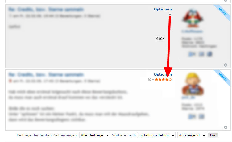 die langerwarteten Credits sind zurück. Jetzt noch attraktiver und fairer. Das neue Bewertungssystem erfordert keine Belohnung mehr von Moderatoren, da die User selbst direkt eingreifen können. Künftig entscheidet nicht die Quantität der Beiträge, sonder die Qualität. Andere User werden euch nur dann mit bis zu 5 Sternen belohnen bzw. bewerten, wenn der Beitrag gut ist. Umgekehrt geht das auch... für sinnlose oder unkonstruktive Beiträge können euch andere User mit Klick auf das "Verboten-Symbol" 2 Sterne abziehen. Wenn das viele machen, kann es natürlich ganz schön ärgerlich für den Autor werden. Außerhalb der Userbewertung erhält man für einen neuen Topic 15 Sterne und für einen Post 5 Sterne (nur wenn er mind. 200 Zeichen lang ist).