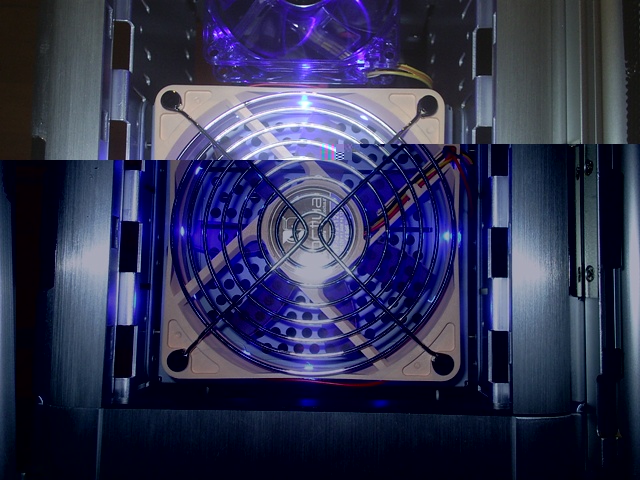 Der Lüfter im Gehäusedeckel mit 6 blauen und 6 roten Led's
