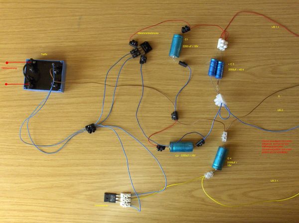 hab versucht die kabel farblich richtig zu verwenden aber ist sicher falsch (bin nur laie) Rot hab cih für + genommen blau für - bzw für wechselstrom nach dem traffo. gelb ist ebenfalls + . braun ist masse.