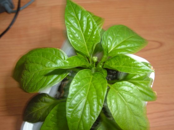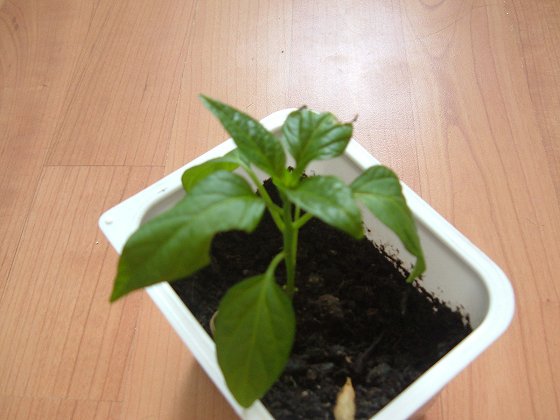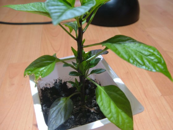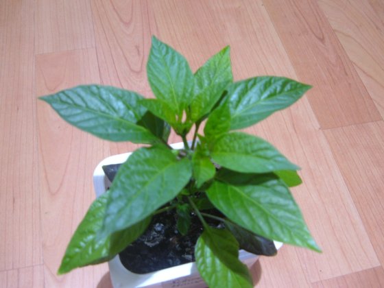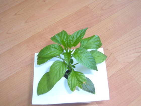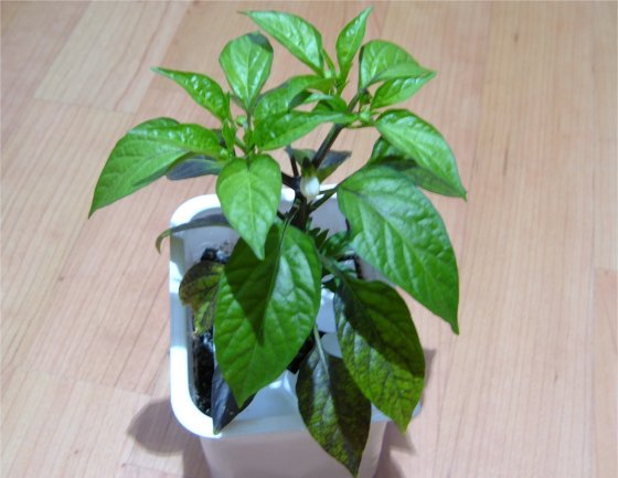 Die Chilipflanze ist 8cm hoch und 11cm breit(breitestte Stelle mit ausgespannten Blättern).