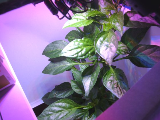 Hier meine Chilipflanze.Da bei uns in den letzen 2 Wochen kaum Sonne da ist steht sie unter der Ledlampe mit je 8 Cree XR-E,4 Royalblau K2 290mw@350ma und 3 K2 Rot.