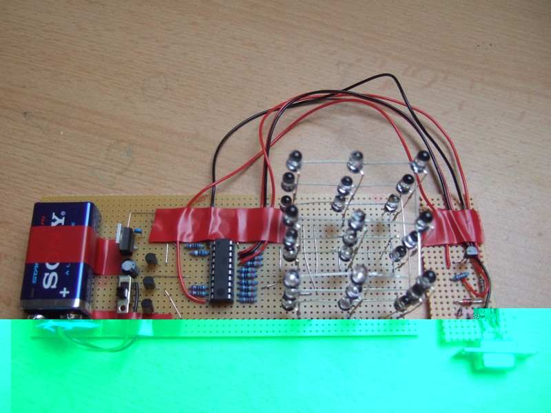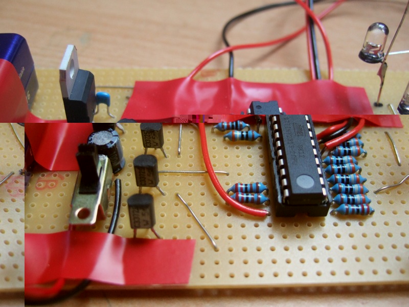 Ich finde die Lösung mit 5V Regler und 9V Batterie sehr 'verschwenderisch'. Der Atmel (egal ob Tiny2313 oder Mega8) läuft zwischen 3V und 5,5V problemlos. Daher haben wir 3 Mignon Zellen verwendet. Voll liefern die etwa 4.8V, leer etwa 3V.