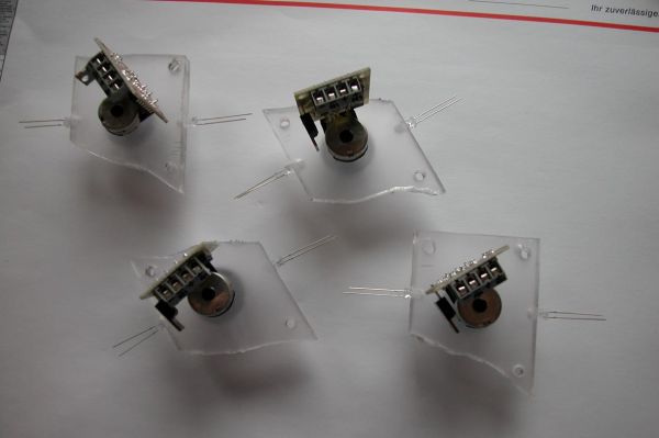 Erst mal in die Plexiteile 5mm Löcher gebohrt, um jeweils 2 Leds zu verkleben. Mit der Form hat es auch was auf sich. Nur so konnte ich die 4 Teile verschrauben. Die Teile haben jeweils 2 oder 3 M5 Gewinde drin.