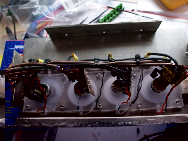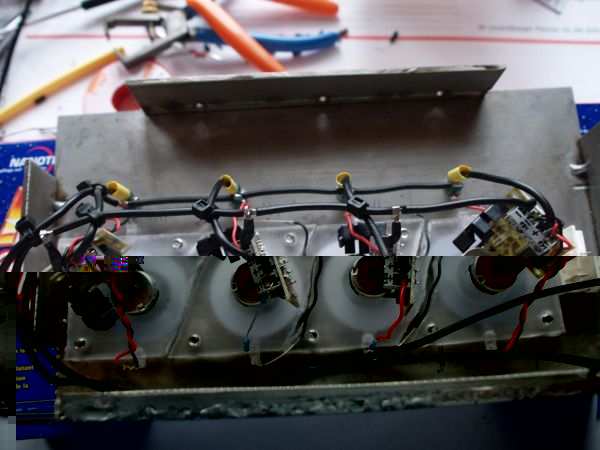 Und heute ging es primär darum, das Steuerpult zu bestücken. Da ich aber keine schnöden Kontrollled wollte musste also was schöneres her. Wie weiter oben schon gesehen hab ich mir so Ringe gebaut. Ist zwar nicht gut angekommen 8) aber was solls. Die neue Lösung sieht auch nicht viel besser aus aber es bleibt ja unsichtbar also ist es mir egal.