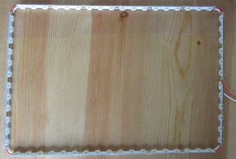 Das Gleiche muss ich jetzt noch mit den RGB Leisten machen. Weiter muss ich noch ein Nut in dem Ausschnitt fräsen, damit man die "Lichtquellen" nicht direkt sieht. Achso, die Leisten sollen dann rings herum in den Holzausschnitt hinter dem Plexiglas eingelassen werden. Von hinten kommt dann eine weitere Plexiglasscheibe auf den Ausschnitt, so dass es auf beiden Seiten hinaus leuchten soll.