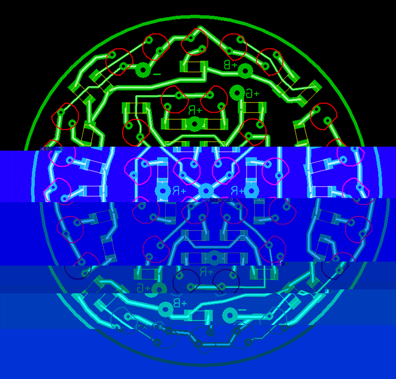 die Platine habe ich mit Sprint Layout 5 entworfen. Ich würde die Wiederständer auf der Platine aber gerne weglassen (zumindest für jede LED einen) damit ich mir hier etwas mehr Platz schaffen kann. Denn es geht doch recht eng zu. Und wenn man "viel" Platz frei machen kann, ist vielleicht noch Platz für die ein oder andere rote oder grüne LED. Welche Ideen hast du dazu? Also ich kann auch ein paar weitere SMD Bauteile einfügen, sollte nicht das Problem sein... Wenn ich es aber umgehen kann würde ich es gerne... das ist immer so klein ;-)