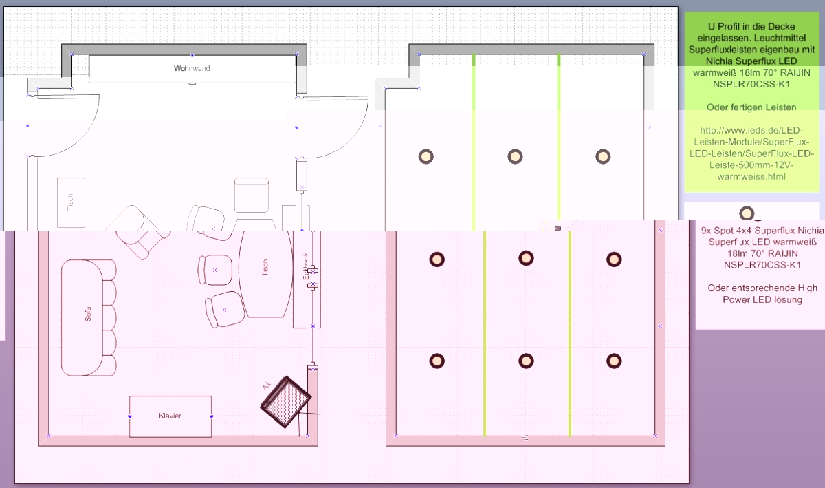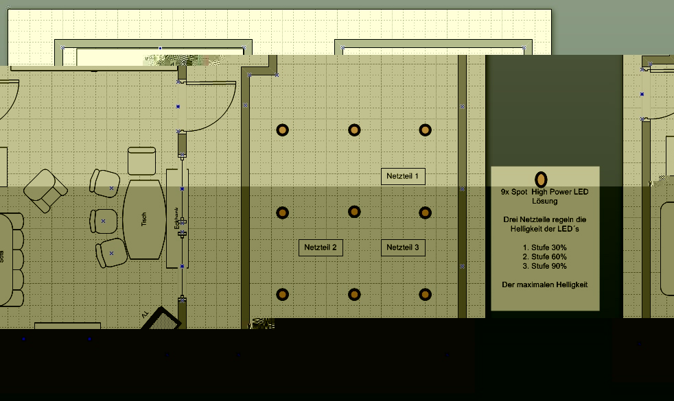 in der Vergangenheit hatte ich an den Fensterfront eine indirekte LED Beleuchtung mit 120 Superflux warmweiß ( 2x2 meter mit je 48 Stück und 1x 50 cm mit 24 Stück) angefertigt, welche gerne wieder integriert werden sollte.