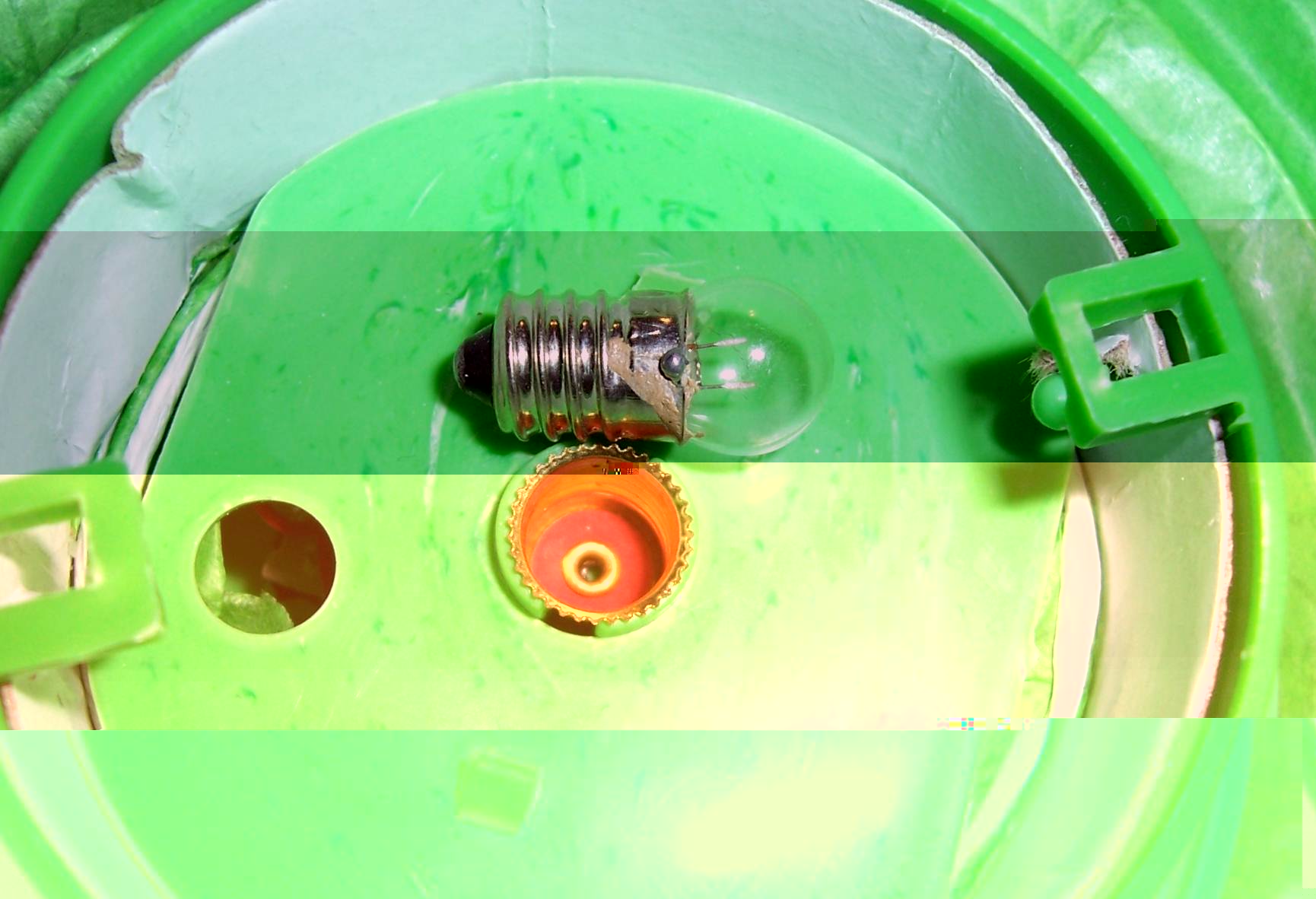 In der Batteriehalterung nimmst Du eine der Batterien heraus, und verbindest die beiden Kontakte (in der Batteriehalterung) mit einem Kabel. So daß die Laterne nur noch mit einer Batterie läuft.