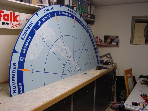 Innenkreis sind 48 warmweiße ultrahelle LED`s die die Sonnenbahn andeuten sollen. Für den Anschluß am Lichtleitkabel diente eine Kabelanschlußmuffe mit jeweils einer LED hinten drin.