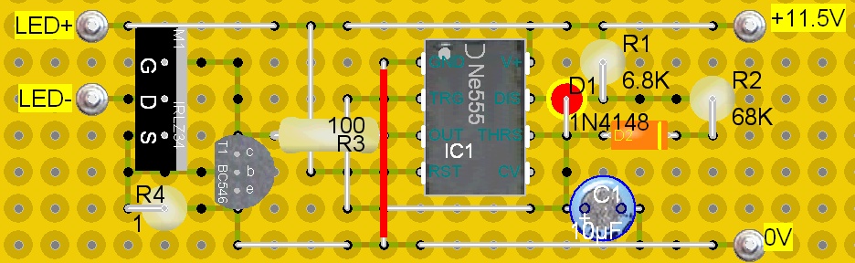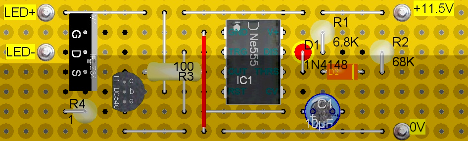 Übersicht (mit 'Durchsicht'): Oberseite: Die Diode D1 muss so eingesetzt sein, dass der 'Strich' oben ist. Kann man bei einer stehend eingelöteten Diode natürlich nicht sehen. Die Verbindung zwischen NE555-GND und Platinen-GND (roter Draht) muss natürlich ein isoliertes Stück Draht sein.