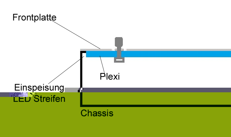 Die Potis werden von der Rückseite montiert, die Leds zwischen Chassis und Plexiglas. Dafür reicht ein Loch im Chassis, wo die Kabel zur Vorderseite verlegt werden können. Die Dicke der Poti-Muttern dient als Abstand für die Plexiglasplatte. Der Zwischenraum reicht für die SMD-Leiste zum Hinterleuchten der normalen Plexiglasplatte (nicht Endlighten) und zum verkabeln.
