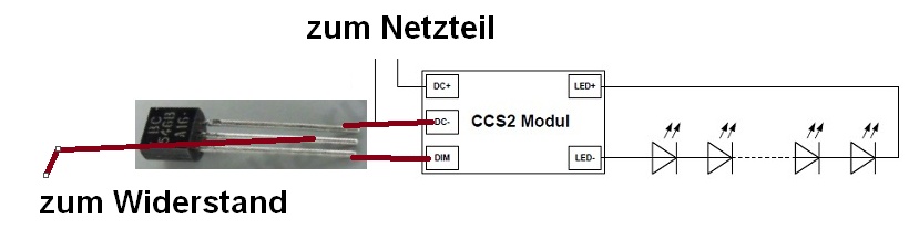 Zuerst mal nur eine KSQ (Transistor noch mal ablöten) mit einem Strang LEDs verbinden, das Ganze am Netzteil anschließen und nochmal versuchen den Dimm-Eingang kurz zu schließen. Vorsicht: Der Dimm-Eingang darf nur mit dem DC(-) Pin verbunden werden. Auf keinen Fall mit DC(+) oder LED-Ausgang.