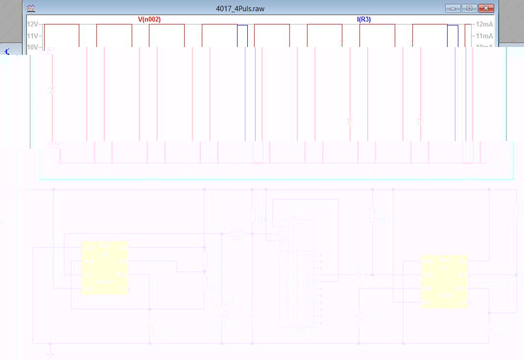 Hier der Schaltplan: Wie schon angemerkt: Funktioniert so nur mit dem 'Original' CD4017BE von Texas Instruments.