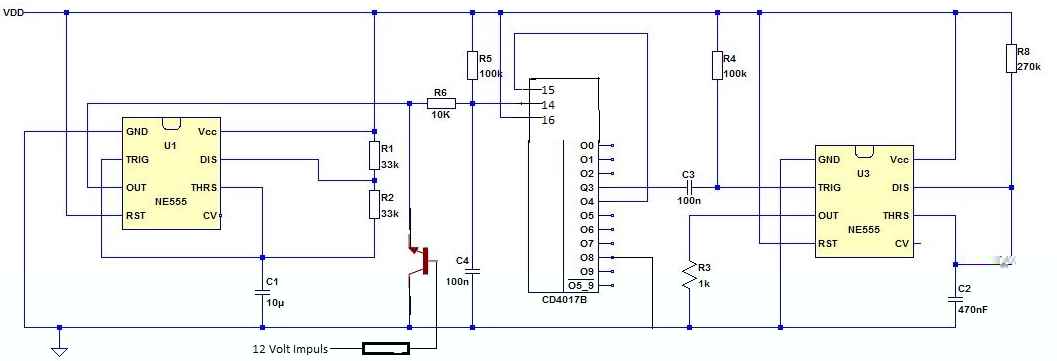 Besser 2 NE555. Gerade wenn Du nur ein prellendes +12V / 0V Signal hast, wirst Du höchstwahrscheinlich um eine Schmitt-Trigger-Monoflop-Eingangsstufe zum Entprellen nicht rum kommen (außer mit einem µC was Du ja aber explizit nicht willst - in dem Fall würde ein 8 Pin IC + 5V Regler und ein paar Widerstände reichen). Nur bei einem freien Relais Kontakt (idealerweise ein Umschaltkontakt) könnte man es auch ohne Eingangsstufe versuchen. Wenn da an dem Relais-Schaltkontakt auch noch was anderes angeschlossen ist, sind weder die Flanken steil, noch kann man eine einfache Entprellung verwenden (hier hatten wir auch so ein Problem: viewtopic.php?f=35&t=15423&hilit=4017&start=50 bei einer ähnlichen Schaltung die ebenfalls mit CD4017B aufgebaut war).Also brauche ich 1x NE555 und einen CD4017B, Kondensatoren und Widerstände.