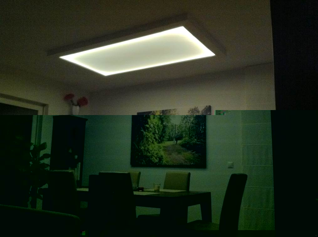 Platz und Stromauslässe sind an der Decke vorhanden. Die Flächen sollen (nur) weisses Licht emmitieren, von warmweiss bis tageslichtweiss und dimmbar sein. Die Flächen sollen ohne Streifen völlig homogen leuchten. Ich stelle mir vor, beim Abendessen auf warmweiss und minimale Beleuchtung zu dimmen und ein paar Kerzen anzuzünden. Oder volle Hütte aufdrehen um über der Couch "freien Himmel überm Kopf" zu simulieren.