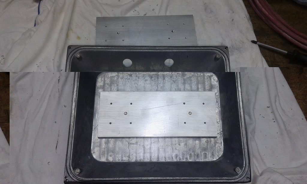 Ich habe seitlich 16er Bohrungen für die Kabelverschraubungen eingebracht und in diesem Fall die Chips verlötet. Zur Kühlung...die beiden Chips werden ca. 90Watt maximal leisten, es kommt aber auch noch ein Lüfter oben drauf. Dazu werde ich die Gewinde der Elektrobox benutzen. Meine Elektronik (Meanwell LCM) und der dazugehörige Dimmer kommen in den Rahmen der Lampe. Da der Strahler auch horizontal liegt und die Elektrobox entfernt ist, wird sich die Passivkühlung sicher verbessern.