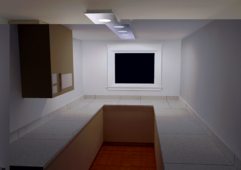 Und, nur zur Erläuterung hier mal zwei Bilder aus dem Renderstudio. In beiden Fällen ist der hinterste Spot an, alle anderen dienen nur zur Deko und sind aus. Unterschied in beiden Bildern ist nur der Leuchtwinkel des Spots, einmal 25Grad einmal 120Grad. Allerdings sind Spots mit 120Grad weniger üblich, aber ich denke man sieht ziemlich genau was ich mit dem vorigen Post meinte, nur der direkte Schatten den man selber wirft, man man sich dazudenken.
