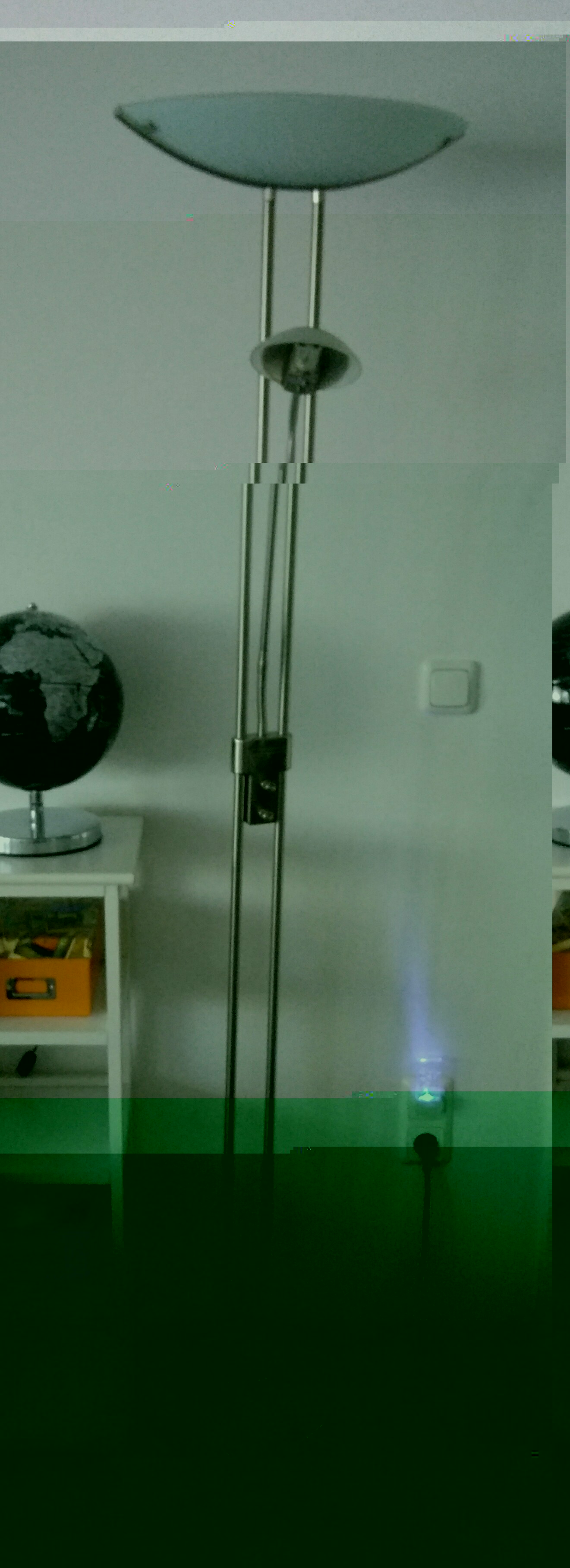 Zum Schluss noch ein paar Bilder vom jetzigen Deckenfluter. Dieser strahlt auch nach unten da dort nur ein knapp 4cm breiter Reflektor unter der Halogenheizungslampe verbaut ist. Die Leselampe an dem jetzigen Deckenfluter wird nicht verwendet.