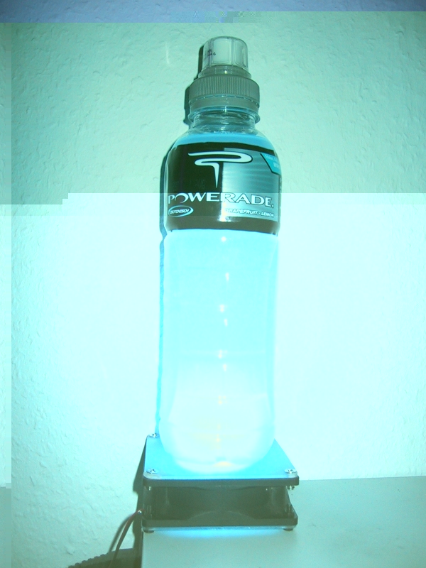 Rein technisch wäre es echt eine gute Idee gewesen den Lüfter drin zu lassen, sodass der nach unten auf die LEDs pustet und die Luft durch Löcher in der Plexischeibe ansaugt. Die Probleme dabei wären dann nur, dass dann eigentlic kein Platz mehr für die LEDs ist, den man sich aber mit einem kleinen Podest schaffen könnte, und, dass das Getränk schneller auf Raumtemperatur ist, als ohn diesen Lüfter. Immerhin kriegt es so nicht die warme Luft von den LEDs ab.