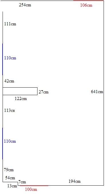 Hier nun erstmal eine kleine ungefäre skizze meines zimmers, Das blaue sind die Fenster und das Rote sind die Türen, mein zimmer ist nicht rechtwinklig, deswegen fehlt Links oben auch was, aber das soll nur als grobe Orientierung Helfen ;-).