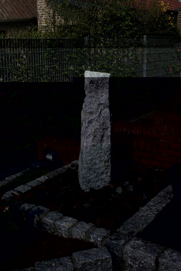 Vielleicht noch kurz zur Funktionsweise: Der Stein, innen mit Bohrung, steht auf einem Stahlgitter, unter dem ein Wasserbehälter steht. Ein darin befindliche Pumpe befördert Wasser durch den Stein nach oben, wo das Wasser wieder austritt und zurück in den Behälter fliesst. Also keine Fontäne. Nur ein behagliches Geplätscher, dass den lauschenden Gartenbesucher bei hohem Getränkekonsum schnell auf die Örtlichkeiten treibt ;-)