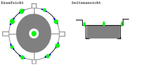 du aknnst die bohrung noch oben noch größer machen(lassen) und dann einen led ring einbauen. Einfacher ist allerding du lötest aus den leds einen ring den du nur noch in das lkoch stecken musst und dort vorsichtig mit epoxidharz/heizkleber einklebst die kabel lässt du nach unten fallen, ich würde dafür balue leds nehmen und dann noch 4 weiße p4 mit kühlkörper und reflektor in epoxidharz als spots in die ecken