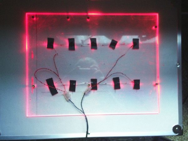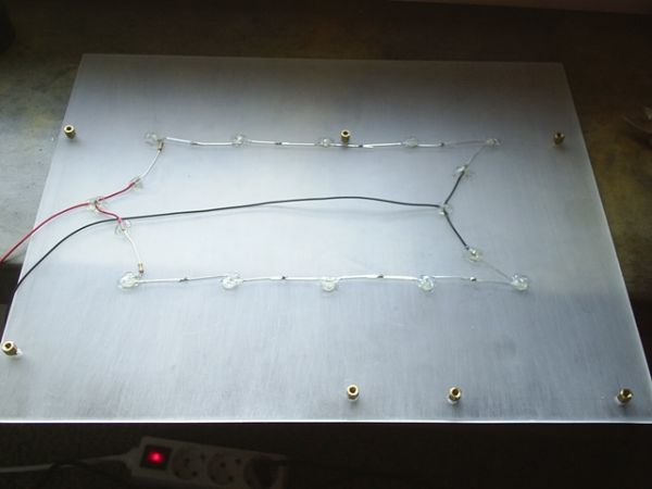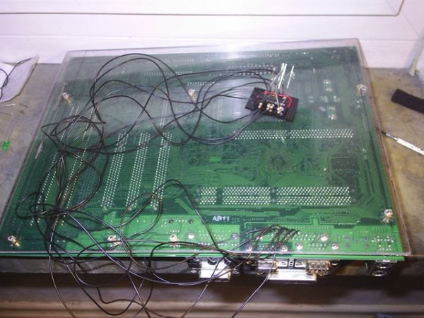 So als erstes müsste ihr die Seiten des Mainboards abmessen damit ihr dann euer Plexiglas zuschneiden könnt, dabei könnt ihr einen wasserfesten Stift nehmen, eignet sich am besten. Natürlich zeichnet ihr auch gleich die Löcher ein wo später dann die Abstands Halter auf das Mainboard darauf kommen, damit das Board etwas Höher liegt. Wenn ihr das alles zugeschnitten habt, dreht ihr einfach die Abstandshalter in das Plaxiglas und verschraubt das ganze mal Probehalber mit dem Mainboard. So nun kommt es darauf an wie ihr hell ihr das ganze haben wollt. Ich selber habe 10 Rote Led's verwendet, dabei habe ich immer 5 Rote Led's in reihe geschalten mit einen 150 Ohm Widerstand. Ich habe das Mainboard zuerst halbiert und in jeder halbierten hälfte noch einmal die hälfte genommen und mit einen gewissen abstand Löcher gebohrt. So dann habe ich die Led's miteinander verlötet und zum Test mal angeschlossen und mit normalem Klebeband befestigt. Hier erstmal ein paar Bilder davon. So das ganze schaute dann doch schon mal sehr gut aus, aber die Ausleuchtung am rande war mit noch zu ungleich, deswegen habe ich das Mainboard noch mal abgeschraubt und die Plexiglasplatte mit etwas Schleifpapier Milchig geschliffen. Wo ich damit fertig war wurden die Led's sauber verklebt und Anschlussfertig gemacht. So das ganze in Aktion auf der Rückseite sah so aus. Hier kann man sehr schön sehen das die beiden oberen sowie unteren Led's geradeaus Leuchteten jeweils nach oben und Unten, die zweit platzierten Led's von oben und unten leuchteten schräg auf die 4 Kanten, und die zwei Led's in der Mitte leuchteten zur Seite, so ist eine gute und gleichmäßige Ausleuchtung gewährleistet. So und hier dann noch ein Abschlussbild des ganzen. Hier schön zu sehen wie gleichmäßig das ganze leuchtet! So das war es auch schon wieder wenn fragen sind könnt ihr sie gerne stellen. Ansonsten bedanke ich mich für das durch Lesen dieses How².
