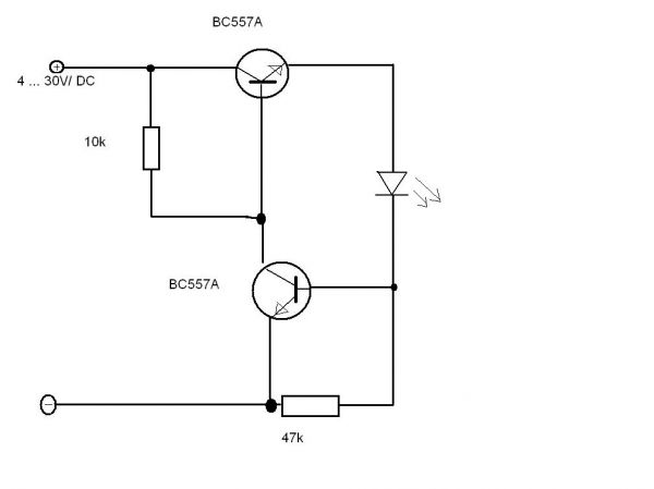 Der Spannungsabfall an der LED geht ans Gate und regelt den Transistor zurück.