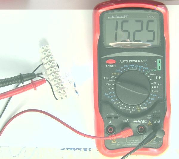 Nun schraube ich alles in meine Lüsterklemmen und schau mal wies gugt. Im Bild sind andere LED´s zu sehen, deswegen auch ein anderer Widerstand
